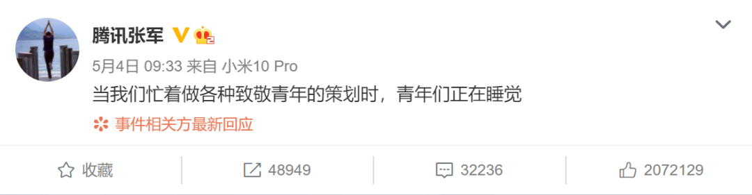 简介大数据文摘出品作者:Caleb五一小长假说没就没,在这里文摘菌先祝大家复工快乐狗头)。作为假期主力军的青年们也在这期间度过了自己的第N个五四青年节。而在5月4日当天,腾讯公关总监在微博上感叹道,“当我