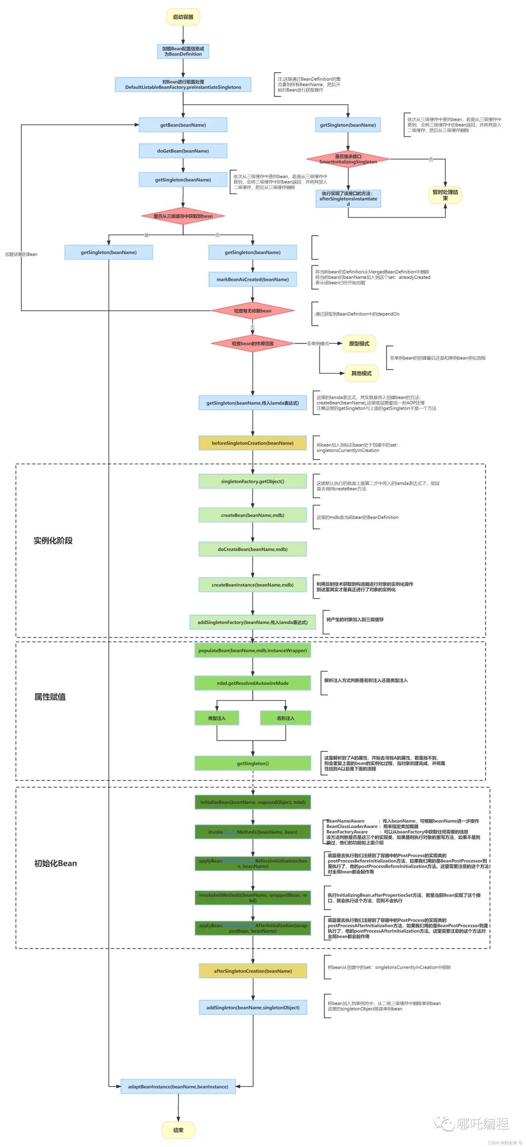 下图是笔者多次翻看IOC源码后总结出来的bean 创建的详细过程,借助该图可以很快的用多理解相关源码。