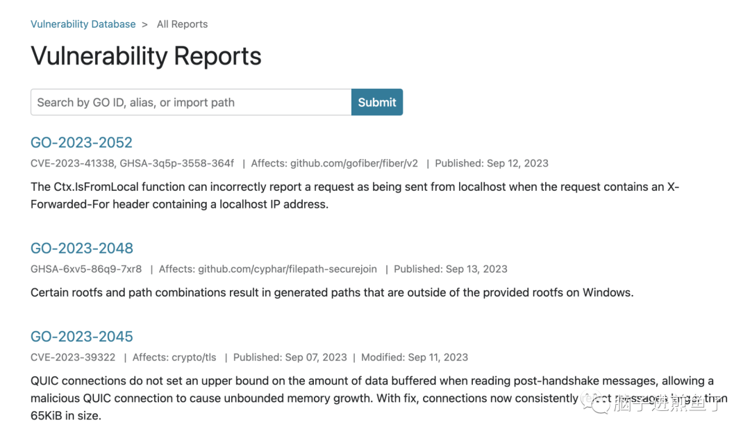 好在 govulncheck 是 “开源” 的亿华云计算(只是个镜像仓库),项目地址:golang/vuln。我们可以看到一些蛛丝马迹:
