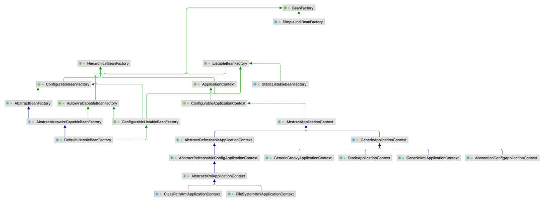 DefaultListableBeanFactoryStaticListableBeanFactorySimpleJndiBeanFactory别看实现类很多,但是其实干活的就是这三个。