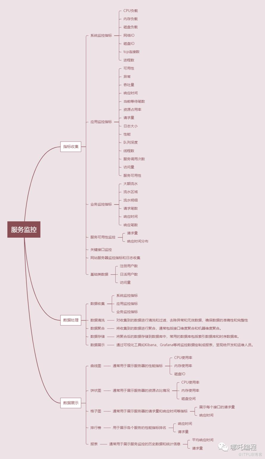 系统监控指标:包括CPU负载、内存负载、磁盘负载、网络IO、磁盘IO、tcp连接数、进程数等。这些指标可以帮助了解服务器的性能和资源使用情况。应用监控指标:包括可用性、异常、吞吐量、响应时间、当前等待笔数、资源占用率、请求量、日志大小、性能、队列深度、线程数、服务调用次数、访问量、服务可用性等。这些指标可以帮助了解应用程序的性能和可用性。业务监控指标:包括大额流水、流水区域、流水明细、请求笔数、响应时间、响应笔数等。这些指标可以帮助了解业务处理的速度和效率。服务可用性监控:包括请求量、响应时间分布等。这些指标可以帮助了解服务的可用性和响应速度。关键接口监控:对关键接口进行监控,了解接口的性能和可用性。网站服务器监控指标和日志收集:对网站服务器的各项指标进行监控和收集,了解网站的性能和可用性。基础类数据:如注册用户数、日活用户数、访问量等,这些数据可以帮助了解服务的用户数量和活跃度。在收集这些指标时,通常会使用一些工具和技术,如接口采集、客户端agent采集、通过网络协议主动抓取等。同时,还需要对收集到的数据进行处理和分析,以提供对服务监控的有用信息,如生成报告、报警通知等。