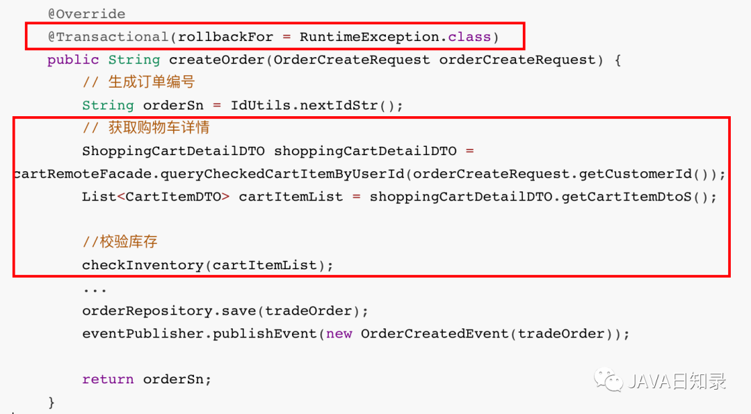 @Override// @Transactional(rollbackFor = RuntimeException.class) public String createOrder(OrderCreateRequest orderCreateRequest){