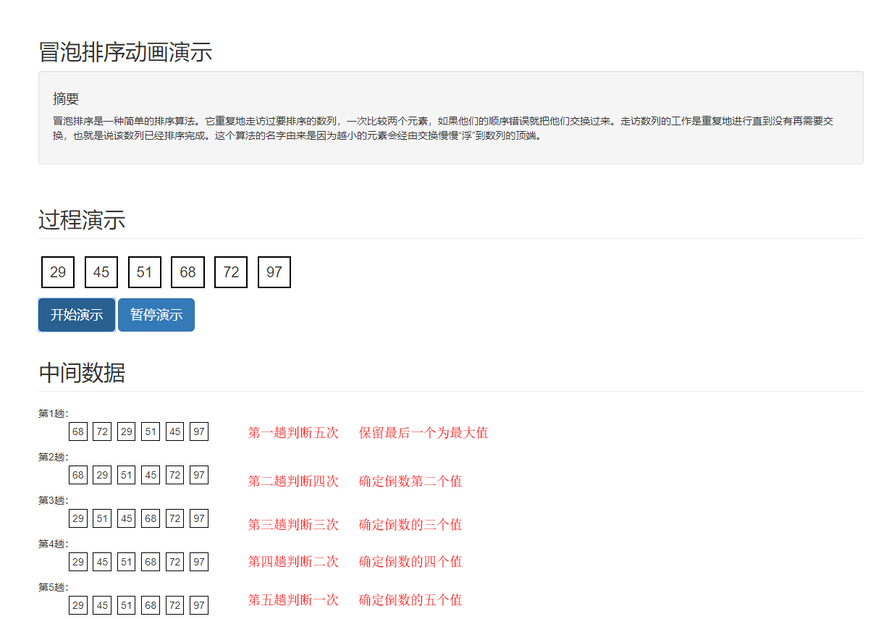 简介冒泡排序:是一种简单的排序算法。它重复地走访过要排序的数列,一次比较两个元素,如果他们的顺序错误就把他们交换过来。走访数列的工作是重复地进行直到没有再需要交换,也就是说该数列已经排序完成。这个算法的名