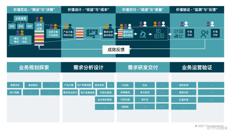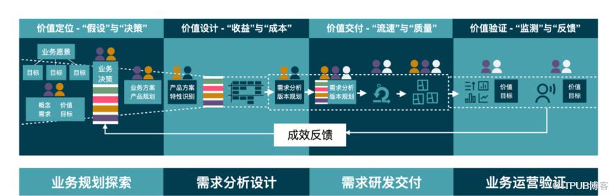 (图5:产品级敏捷2层虚拟团队)第二阶:建机制有了清晰的业务架构和与之对齐的组织架构之后,最需要的就是有相应配套的价值创造流程和团队运作机制,让相关的每个人清楚如何转变、如何协作。 第3步:制定价值闭环流程产品级敏捷的端到端流程我们定义为“业务规划探索”、“需求分析设计”、“需求研发交付”和“业务运营验证”四个阶段,这四个阶段分别对应于价值创造的“价值定位”、“价值设计”、“价值交付”和“价值验证”。