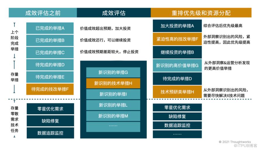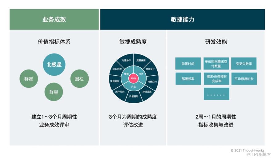 (图11:价值评审后产品决策调整)第8步:数据驱动持续改进相比于团队级敏捷关注团队的研发效能,产品级敏捷会从下面两个视角来进行组织能力的持续改进。 业务成效视角:围绕业务的北极星、群星指标和举措需求的价值指标,持续周期性地审视产品的成效是否达成,基于运营数据进行差距分析,对产品的演进路线进行动态的定期调整,构建起业务成效验证的价值闭环机制。 敏捷能力视角:在敏捷成熟度中增加目标管理、产品创设、业务运营等维度的团队能力评估,制定体现产品级敏捷的研发效能指标并周期性收集数据,按季度开展改进计划的制定,构建起敏捷能力建设的持续改进机制。