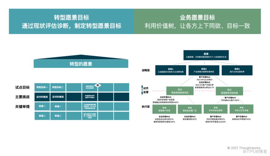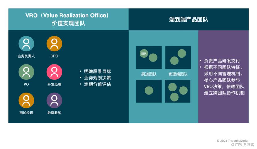 (图4:对齐转型与业务愿景目标)第2步:定义团队角色职责转型与业务的愿景目标对齐之后,需要围绕“业务成效”进行多层次的团队设计,明确团队职责,识别团队角色,定义各方职责。现阶段中国的银行业组织架构主要按职能进行业务和科技的部门划分,短期内难以对其组织结构进行调整。基于这样的现状,我们推荐组建两层虚拟团队。第一层是以核心角色组成的价值实现团队,进行业务规划与决策。第二层为基于业务领域/场景划分的一线团队群,组建端到端的产品团队。