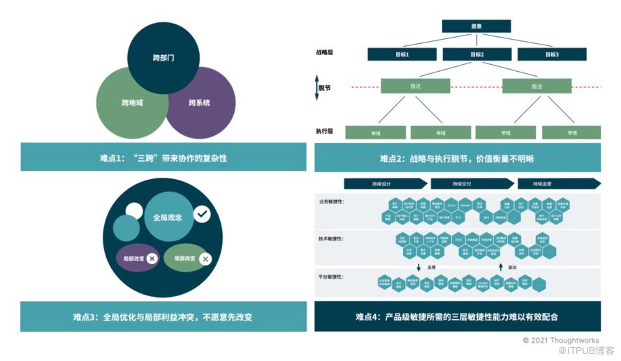 亿华云没办法端到端打通,业务蜻蜓点水,怎么也敏捷不起来;需要端到端创造并衡量价值:以用户为中心、产品为中心,抓住价值的端到端交付,同时要做好产品上线后的成效度量,持续演进产品,比如类似于互联网产品研发,要做到“有人生,还得有人养”,并且要能“养大养好”。落地产品级敏捷所需面对的4大核心难点:“三跨”带来的协同复杂性、战略与执行脱节、全局优化与局部利益冲突、三层能力配合难以有效协同。
