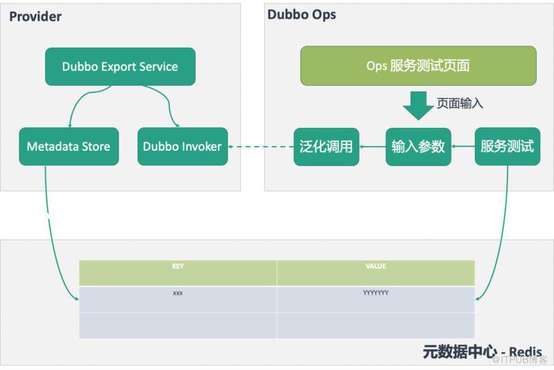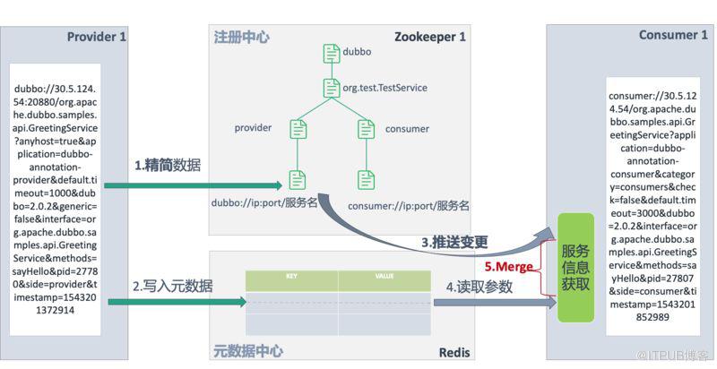 注册中心作为服务的注册和发现,更加关注数据的实时性和有效性 (watch 机制),整个 URL 中 IP 和端口就能判断某个服务是否可用,其他信息都是相对固定不变的。所以注册中心中,只需要存储 IP 和端口。元数据中心中存储 URL 中除 IP 和端口外的其他信息,加上服务测试需要的服务方法名,服务方法的出入参信息。元数据是一个 KEY-VALUES 的持久化存储,是独立于注册中心的存储,它不需要有 watch 的机制,而只需要提供持久化存储。图中使用的的 KEY VALUE 存储是 Redis,但是元数据中心定义了一套 SPI,开发者可以去扩展,可以自己实现 DB 存储,或者其他持久化存储的方式。
