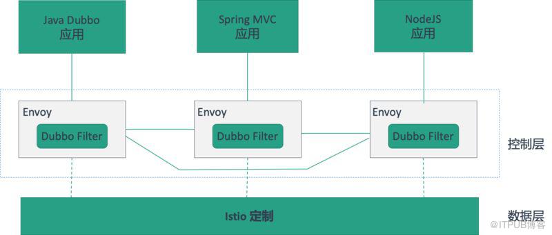 从实现方式上来说,阿里没有重复的造轮子,控制层这一块(也被称为 sidecar),是在 Envoy 上进行了一些扩展,实现了一个 Dubbo Filter,现在这部分代码已经被捐献到了 Envoy 的社区。数据层实现方式是对 Istio 做了一些扩展和定制。因为 Istio 有一套默认的服务发现,服务治理的产品,但阿里巴巴有自己的服务发现,动态配置管理,服务治理的产品方案。在数据层,会将 Istio 和阿里巴巴中间件的产品做一些整合,来满足需求。
