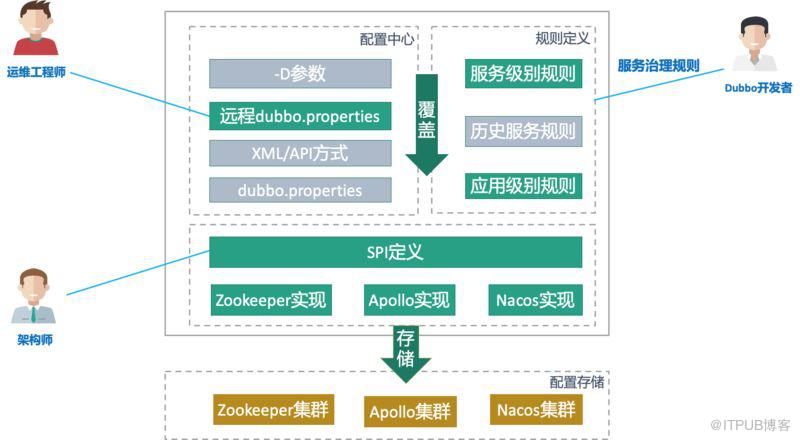 解决方案图中分成上下两部分,下面黄色部分就是它的一个存储;上面的整个部分是 Dubbo 内部实现。上文中所讲的动态配置,在 Dubbo 中定义为配置中心。
