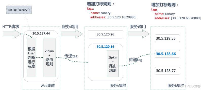 整体调用链路总结。满足灰度验证的用户链路:web 服务 -> 30.5.120.16 -> 30.5.128.66; 不满足灰度验证的用户 (不打标) 链路:web 服务 -> 集群中 30.5.120.16 之外的机器 -> 集群中 30.5.128.66 之外的机器。