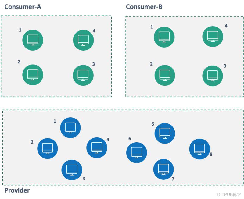 集群从集群角度来看下,服务实例之间的隔离。假设一个 Provider 集群有 8 个实例,Consumer-A 集群有 4 个实例,Consumer-B 集群有 4 个实例; Consumer-A 集群和 Consumer-B 都会调用 Provider 集群。
